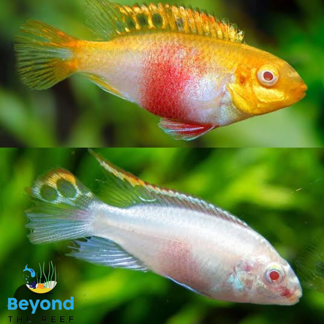The Albino Kribensis originated in southern Nigeria and Cameroon, specifically in the African waters near the mouth of the Ethiop River. This albino variation of the Kribenis species is known for thriving in shallow, vegetation-rich environments and can adapt to various levels of water hardness.