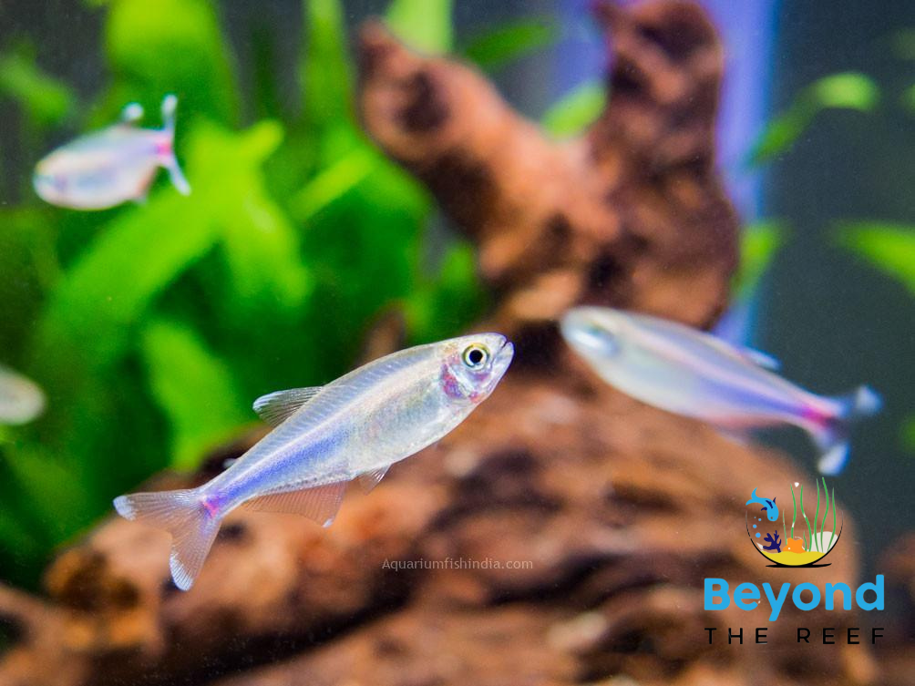 It is one of the few freshwater aquarium fish that has bright blue coloration. In the case of Cochu's Blue Tetra, most blue coloration is on the back half of an otherwise nearly transparent body. There is also often pink coloration at the base of the tail.