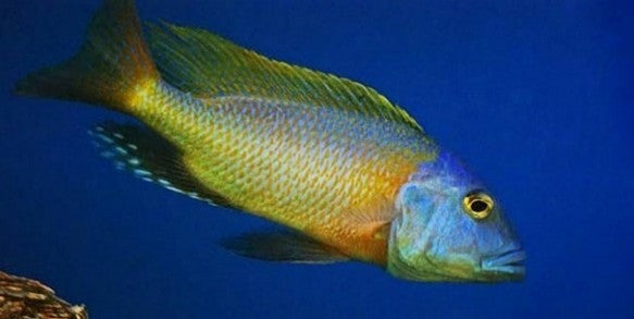 Buccochromis rhoadesii, sometimes called the Yellow Leptura Cichlid, are large and need a lot of space to swim. They are not recommended for tanks smaller than 100 gallons. They are piscivorous and will chase smaller fish to eat. They are found over sandy substrates in Lake Malawi. Some of these have very minor black pigmentation spots. These spots are harmless and are typically associated with diet.