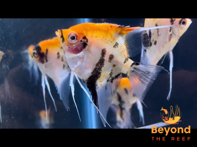 A cichlid that is laterally compressed and has a disc-shaped body with long, extended fins is called an angelfish. The caudal fin is fan-shaped, whereas the dorsal and anal fins are tall and straight. The color of the eye's iris is frequently red.