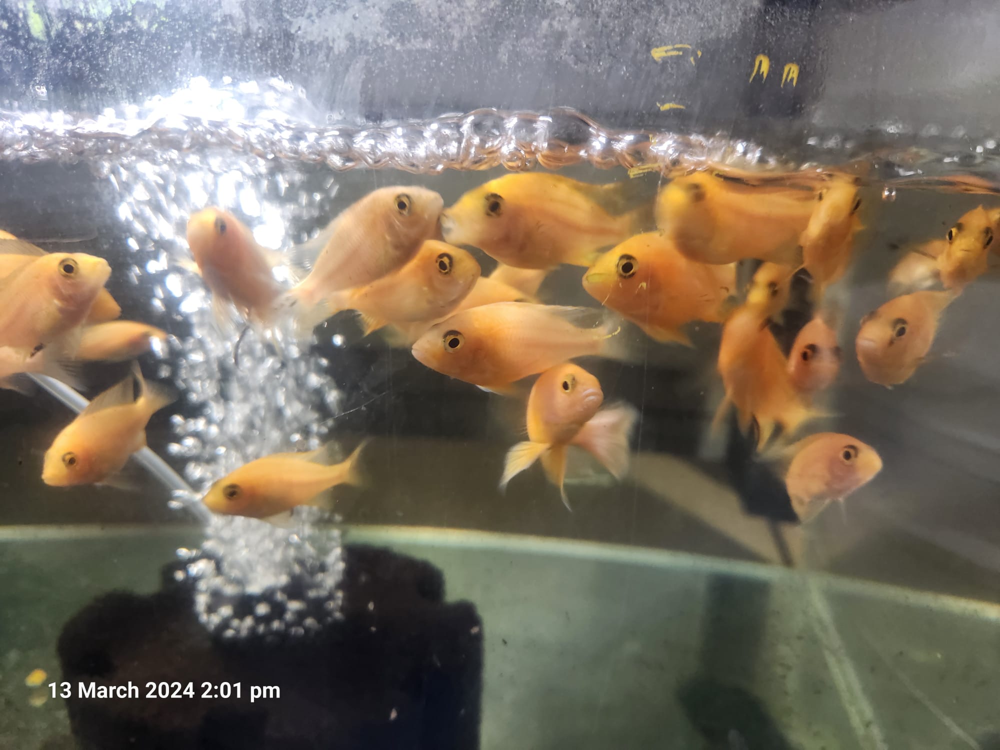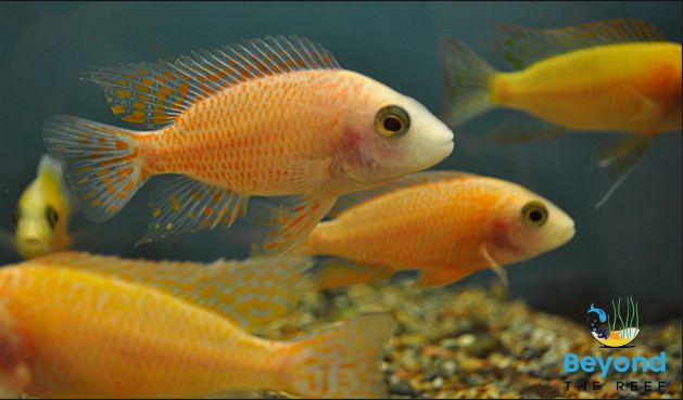 Imagine the vibrant gold and tangerine hues gliding gracefully through the water, bringing an instant touch of elegance to your aquatic haven. These cichlids aren't just fish; they're living artworks that will breathe new life into your tank.