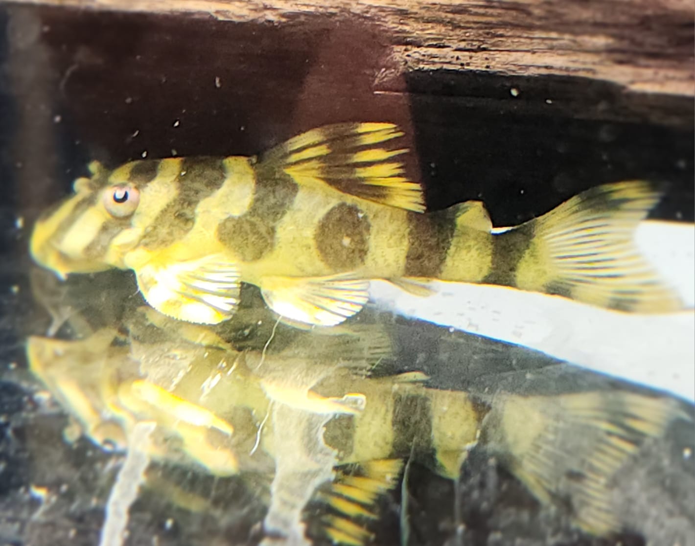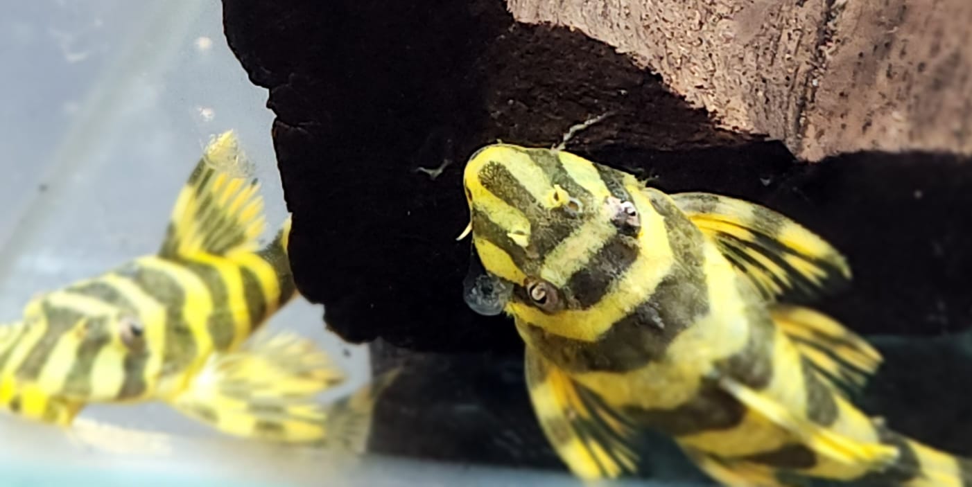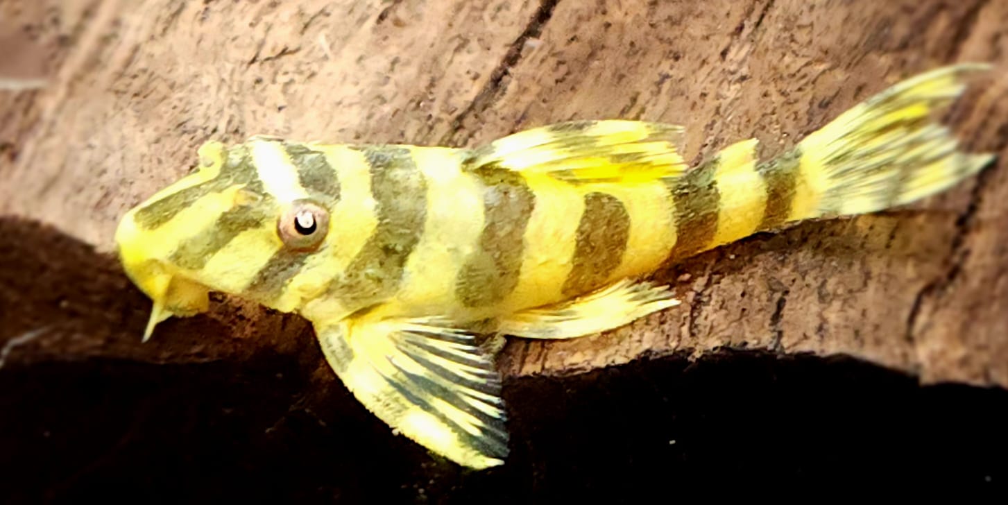 Appearance: This fish has black and yellow zebra-like stripes and is a member of the Loricariidae family of South American catfish.