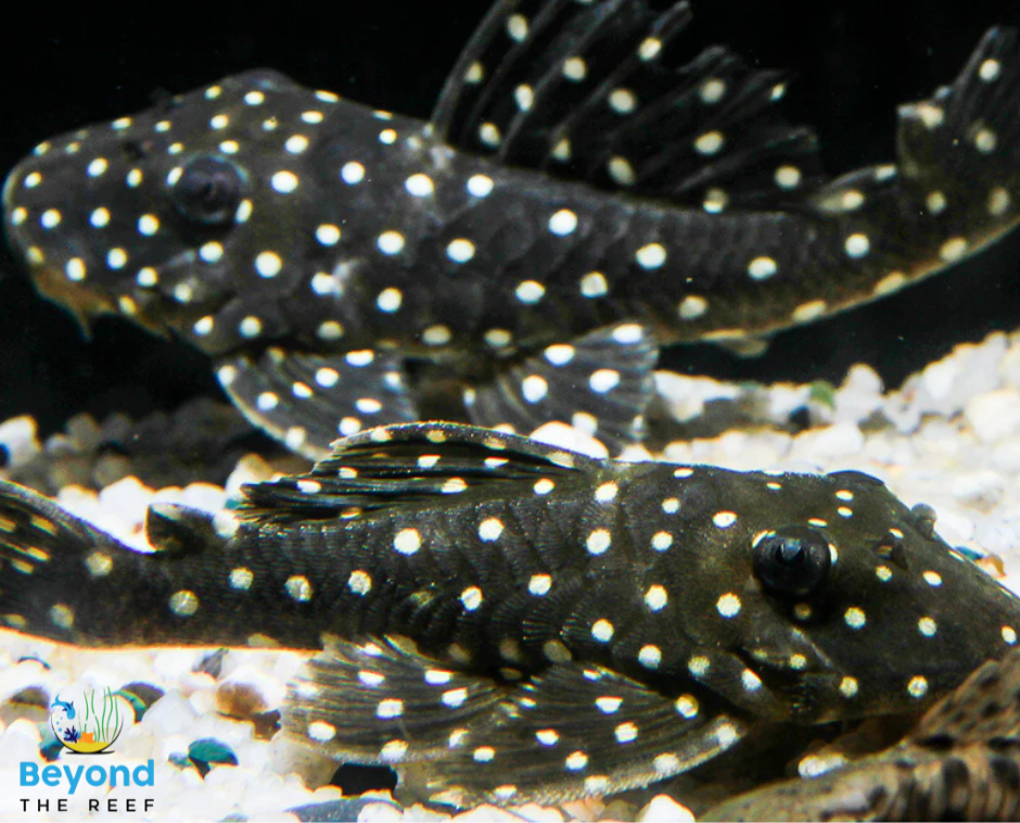 Enhance the allure of your freshwater aquarium with the majestic Pleco L201, also known as the Snowball Pleco. Originating from the Orinoco River basin in Venezuela, this captivating species boasts a striking appearance with a dark body adorned by bright, distinctive white polka dots, making it a standout addition to any aquatic environment.