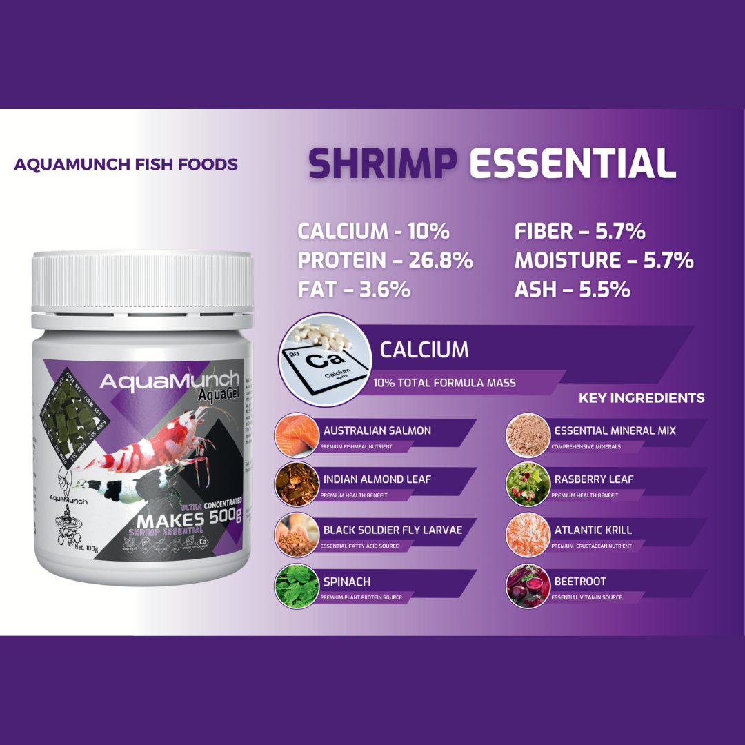 Shrimp Essential is expertly formulated with 10% water-fortified calcium, crucial for healthy shell development and successful moults. This high quality diet supports shrimp vitality and vibrant colouration while reducing mortality caused by moulting issues. Essential nutrients ensure your shrimp thrive, making it an ideal choice for optimal shrimp health.