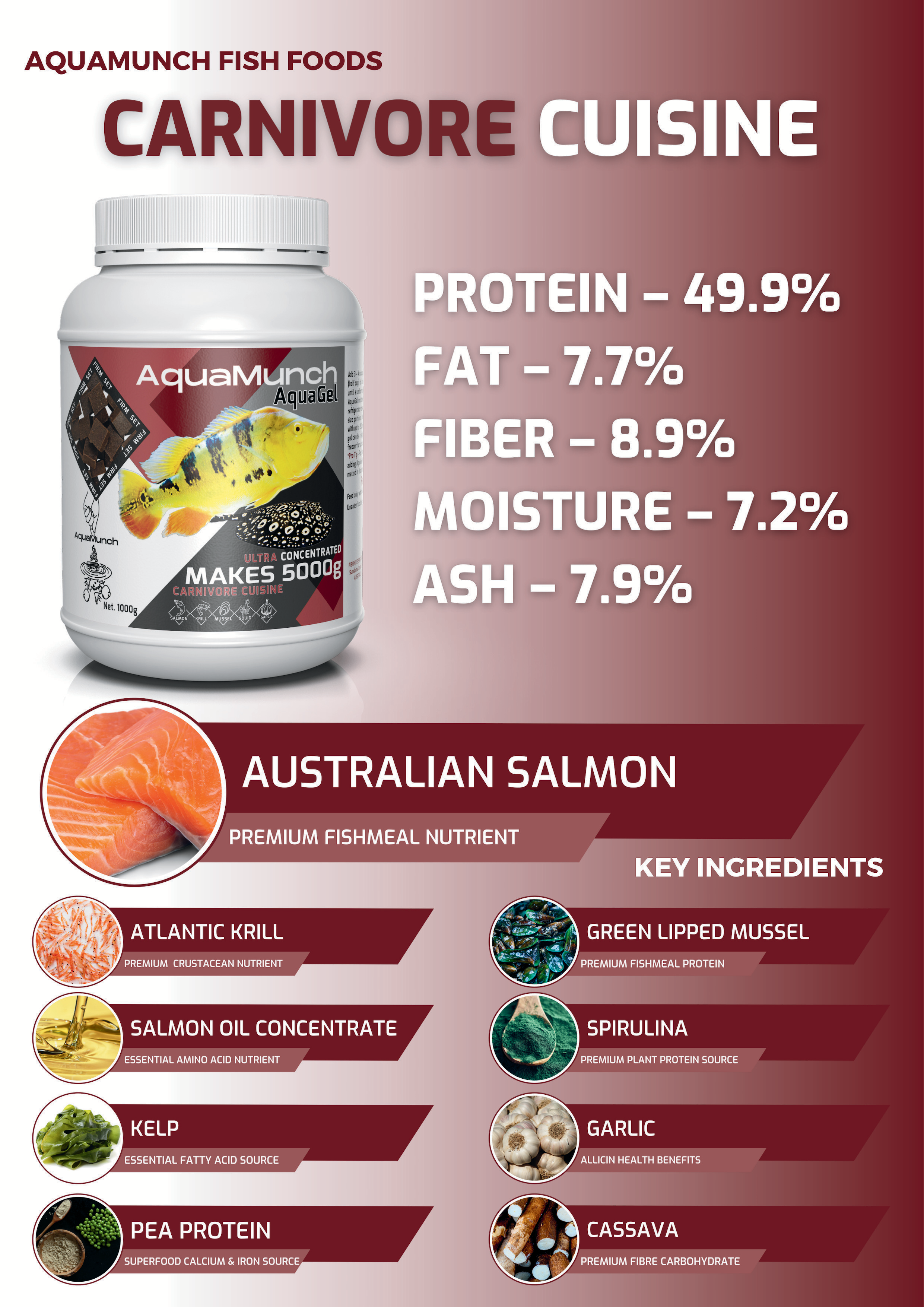Carnivore Cuisine is expertly formulated for carnivorous fish, featuring a synergistic blend of Australian Salmon, Green Lipped Mussel, Squid and Atlantic Krill. This diverse protein mix achieves a 49% protein concentration, ensuring all nutritional needs for optimal growth and vitality of predatory fish.