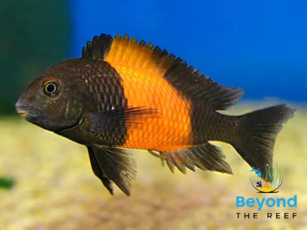 The Tropheus bemba is a vibrant cichlid species native to the rocky shores of Lake Tanganyika in East Africa. Recognizable by its striking black body adorned with a bright red or orange band near the head, this fish is known for its territorial behavior and social structure. It thrives in well-oxygenated waters with plenty of rocks to graze on algae and establish territories. Due to its unique appearance and interesting behavior, it is a popular choice among cichlid enthusiasts.