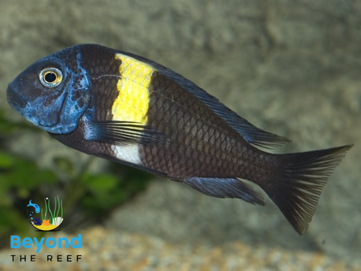Tropheus duboisi maswa "white dot" juvenile clothing is distinguished by a background hue that is blue-brown and an abundance of tiny white dots that are roughly organized in rows. The caudal fin is black, and the dorsal fin likewise has a dot pattern.