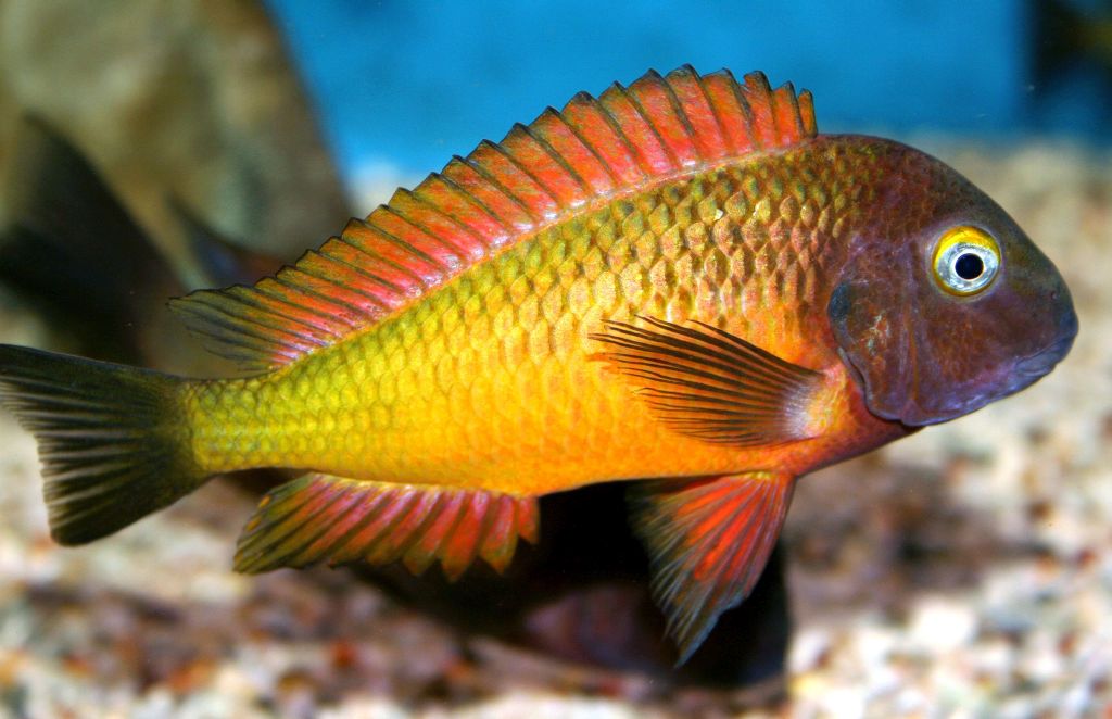 Native to the rocky regions around Nkamba Bay, the stunning yellow, red and purple colors of the Tropheus Ilangi make it one of the most sought after species of Tropheus in the aquarium hobby. These Lake Tanganyika cichlids are some of the most colorful in the hobby. They feature a purple colored head, a bright yellow body and red dorsal, pelvic, and anal fins.