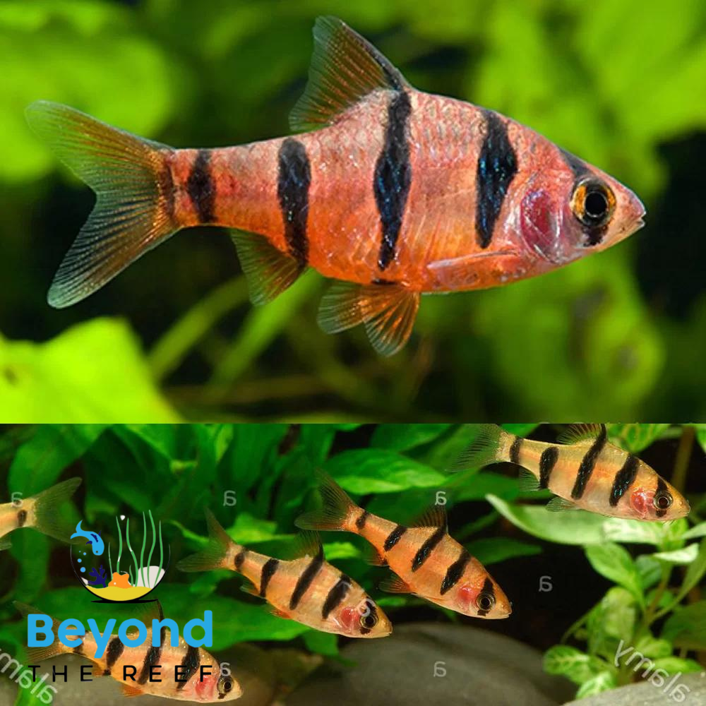 The Five Banded barb is a visually appealing species of freshwater fish that appeals to aquarium enthusiasts. Its orange to red body is adorned with a unique pattern of five dark bands. They are a calm and lively kind of fish. This species is found natively in warm, somewhat acidic dark waters, and it thrives in schools of six or more.